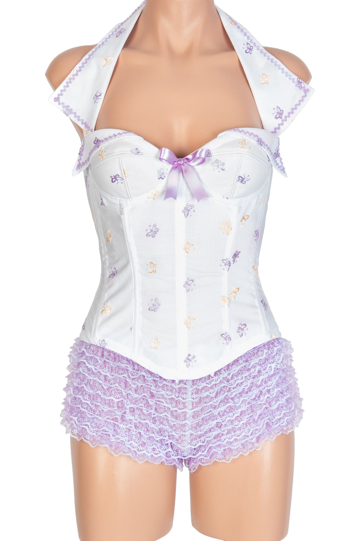 She'll be everything her man wants her to be when adorned in this halter lapel corset. Features darling lapel accents and a dainty bow. Metal stays keep you looking slim and trim. Hook and eye closure at the halter and along the back of the garment.