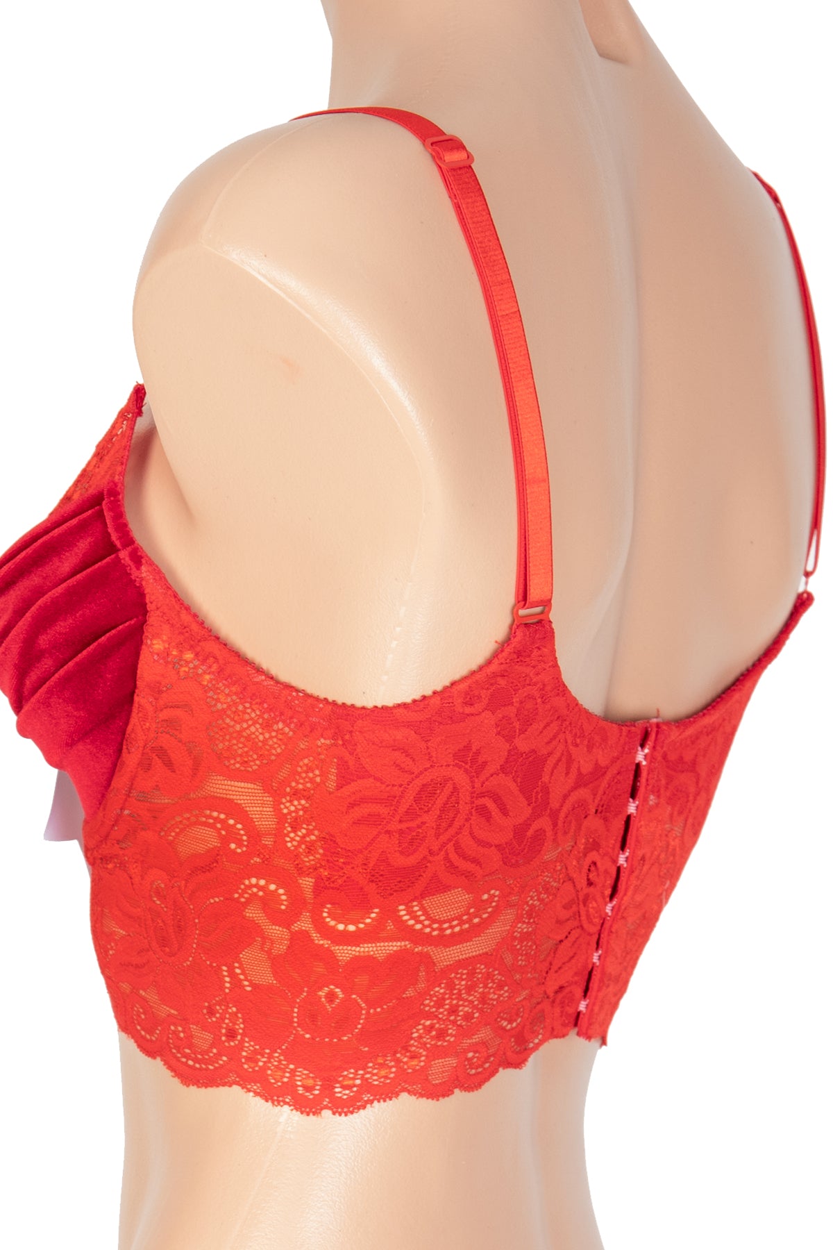 This Peppermint Underwire Bra features folds of striped spandex that ruche between the cups, accentuating your voluptious bust. Sweetheart lace trim, hook and eye closure at back and an oversized satin bow at the cleavage completes this ravishing bra.